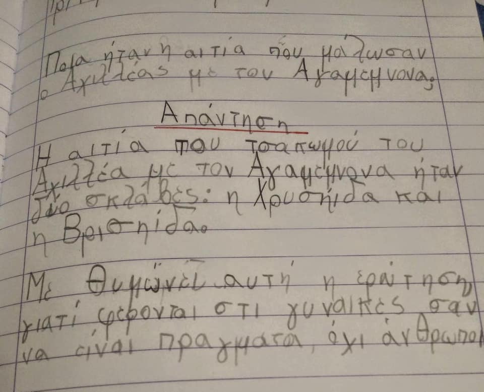 Η 8χρονη απάντησε ολόσωστα ότι “Αιτία του τσακωμού των δύο ηρώων ήταν δυο σκλάβες: η Χρυσηίδα και η Βρισηίδα.” Όμως ακριβώς από κάτω δεν δίστασε να κάνει και το δικό της σχόλιο για την εν λόγω αντιμετώπιση των γυναικών και γράφει τα εξής “Με θυμώνει αυτή η ερώτηση γιατί φέρονται στις γυναίκες σαν να είναι πράγματα, όχι άνθρωποι”.