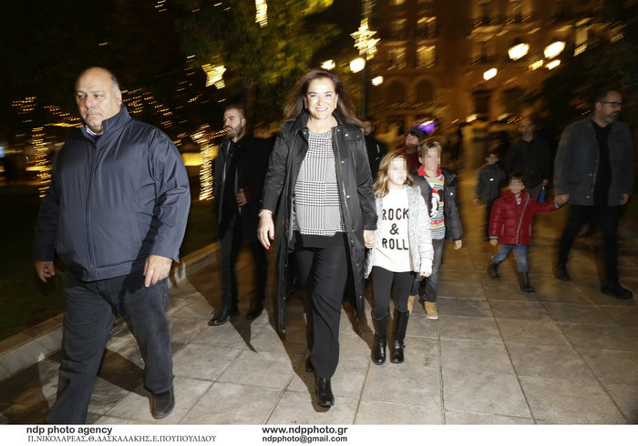 Έτσι, ο φακός την απαθανάτισε να κρατά από το χέρι την 6χρονη Ολυμπία – Ασπασία και να κατευθύνονται κάτω από τη σκηνή, όπου έλαβαν χώρα οι εορτασμοί και οι συναυλίες. Δείτε το σχετικό βίντεο του ΑΠΕ-ΜΠΕ: