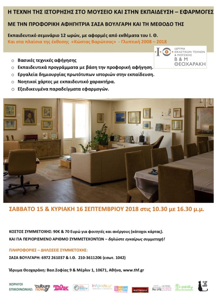 Η αφηγήτρια Σάσα Βούλγαρη, πρωτοπόρος και με πορεία 25 χρόνων στο αντικείμενό της, συντονίζει για 2η χρονιά στο Ίδρυμα Θεοχαράκη ένα βιωματικό – διαδραστικό εργαστήρι για την αξιοποίηση της Τέχνης της Αφήγησης σε εκπαιδευτικά προγράμματα μέσα στο μουσείο αλλά και σε κάθε χώρο εκπαίδευσης.