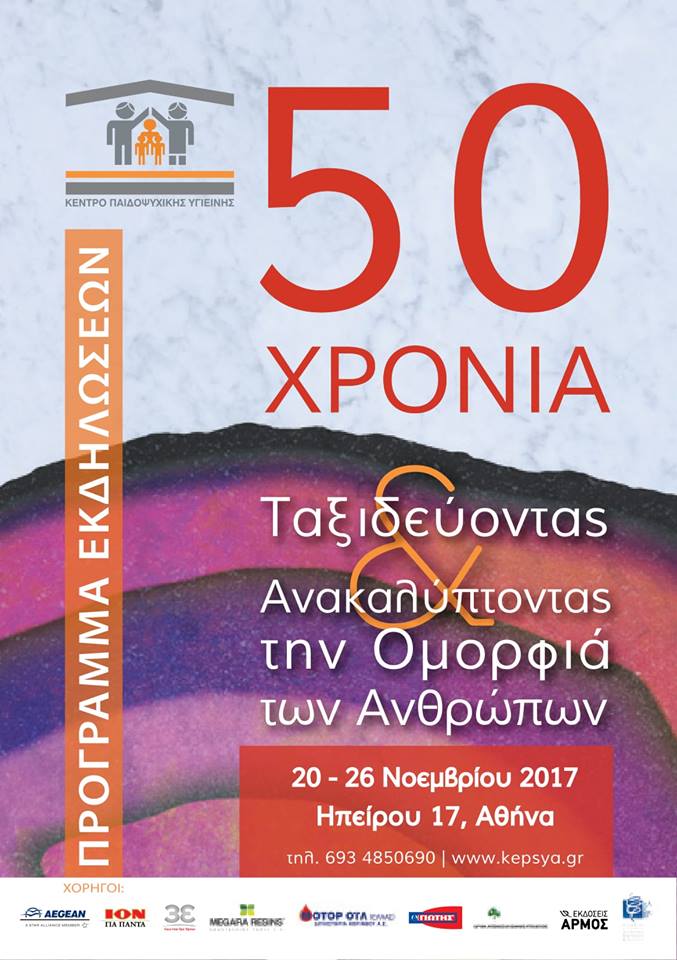 Με αφορμή τον εορτασμό των 50 χρόνων λειτουργίας του, αμέτρητες δωρεάν εκδηλώσεις έχουν προγραμματιστεί από την Δευτέρα 20 έως και την Κυριακή 26 Νοεμβρίου, τις οποίες αξίζει να παρακολουθήσουν όλοι οι γονείς και τα παιδιά, καθώς πρόκειται για ενδιαφέρουσες ομιλίες, εργαστήρια για εκπαιδευτικούς, ψυχολόγους και φροντιστές, σεμινάρια για γονείς, μα και καλλιτεχνικές εκδηλώσεις (συναυλία με τον Νίκο Πορτοκάλογλου στις 25/11) και υπέροχες δραστηριότητες που μπορούν να παρακολουθήσουν τα παιδιά. Δείτε αναλυτικά το πρόγραμμα παρακάτω και… κλείστε θέση για τη δική σας συμμετοχή!