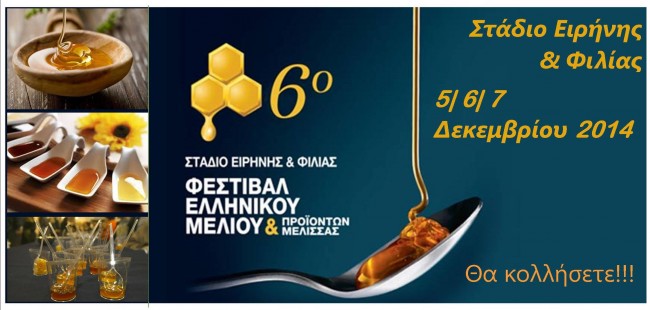 Την Παρασκευή 5 Δεκεμβρίου ανοίγει τις πύλες του το 6ο Φεστιβάλ Ελληνικού Μελιού & Προϊόντων Μέλισσας. Το μέλι… θα ρέει άφθονο στο Στάδιο Ειρήνης & Φιλίας αφού περισσότεροι από 150 μικροί παραγωγοί θα προσκαλούν το κοινό να απολαύσει το μέλι τους. Οι καταναλωτές θα έχουν την ευκαιρία να δοκιμάσουν και να προμηθευτούν μέλι, από τους ίδιους τους παραγωγούς, από όλες τις περιοχές της χώρας μας που παράγουν αγνό – ποιοτικό μέλι, όπως Βυτίνα, Κρήτη, Πιερία, Μεσσηνία, Ηλεία, Ικαρία, Κάρπαθο, Κέα, Λήμνο, Λέσβο, Τήνο, Ιωάννινα αλλά και το Άγιο Όρος. Πολλά κεράσματα και παραδοσιακά εδέσματα θα περιμένουν τους επισκέπτες του Φεστιβάλ και οι μικροί μας φίλοι θα έχουν την ευκαιρία να απασχοληθούν δημιουργικά καθόλη τη διάρκεια του τριημέρου στον παιδότοπο του φεστιβάλ με εκδηλώσεις με κεντρικό θέμα «Γνωρίστε το μικρόκοσμο της μέλισσας».