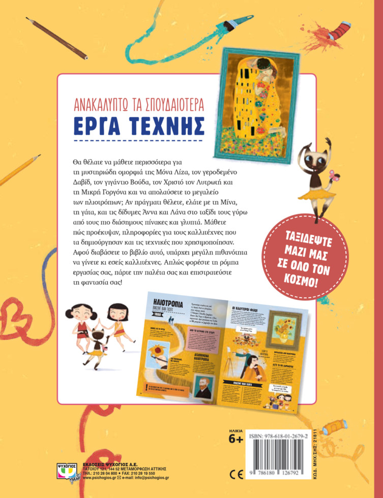 Θα θέλατε να μάθετε περισσότερα για τη μυστηριώδη ομορφιά της Μόνα Λίζα, τον γεροδεμένο Δαβίδ, τον γιγάντιο Βούδα, τον Χριστό τον Λυτρωτή και τη Μικρή Γοργόνα και να απολαύσετε το μεγαλείο των ηλιοτρόπιων; Αν πράγματι θέλετε, ελάτε με τη Μίνα, τη γάτα, και τις δίδυμες Άννα και Λάνα στο ταξίδι τους γύρω από τους πιο διάσημους πίνακες και γλυπτά. Μάθετε πώς προέκυψαν, πληροφορίες για τους καλλιτέχνες που τα δημιούργησαν και τις τεχνικές που χρησιμοποίησαν. Αφού διαβάσετε το βιβλίο αυτό, υπάρχει μεγάλη πιθανότητα να γίνετε κι εσείς καλλιτέχνες. Απλώς φορέστε τη ρόμπα εργασίας σας, πάρτε την παλέτα σας και επιστρατεύστε τη φαντασία σας!