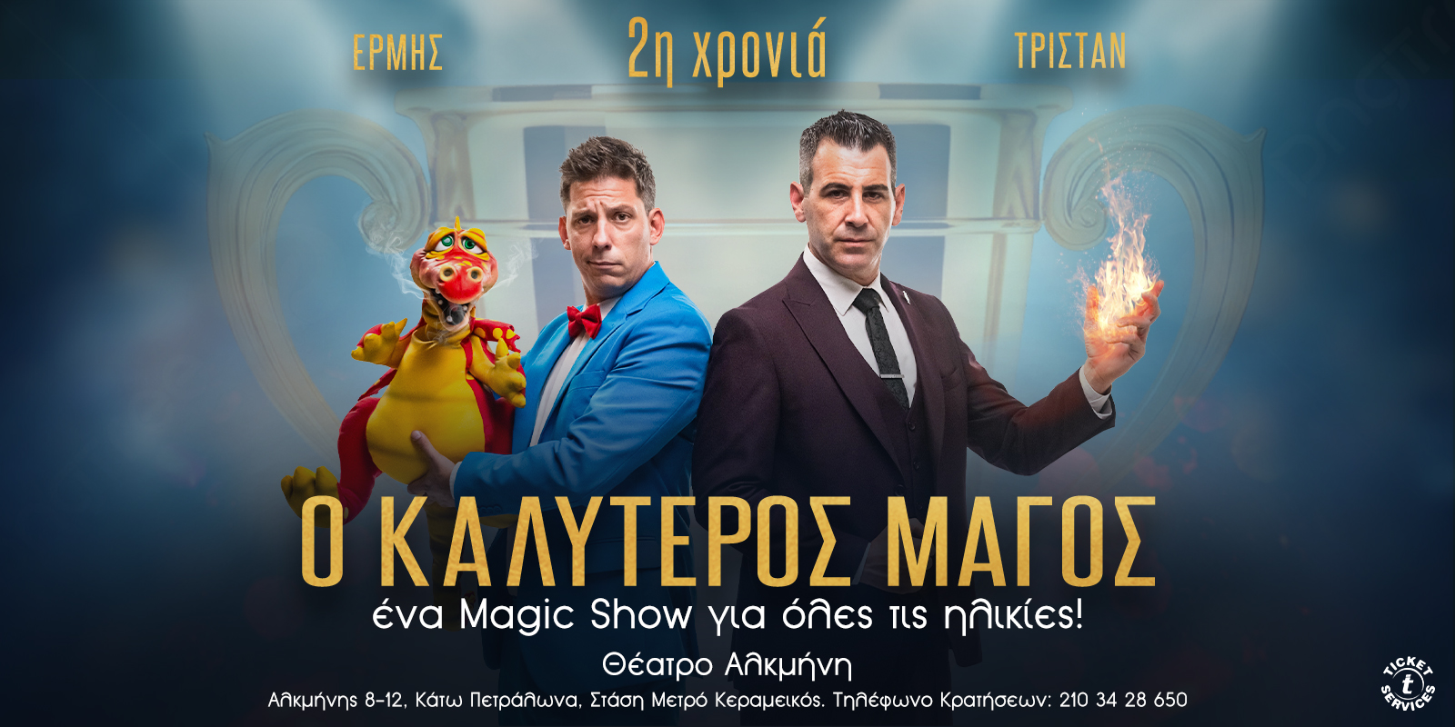 Οι μάγοι Τρίσταν & Ερμής έρχονται στο θέατρο Αλκμήνη αποφασισμένοι να σας μαγέψουν, να κερδίσουν το χειροκρότημα σας και το κύπελλο του καλύτερου μάγου, με τα εντυπωσιακά & πρωτότυπα μαγικά τους κόλπα!
