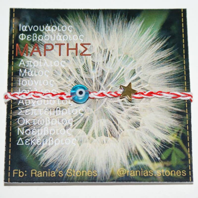 - Δηλώστε συμμετοχή στο διαγωνισμό για να είστε ένας από τους 3 τυχερούς αναγνώστες που θα κερδίσουν από ένα υπέροχο χειροποίητο βραχιολάκι “Μαρτάκι” δια χειρός Rania’s Stones by Rania Panagou. Το Μαρτάκι είναι πλεκτό στο χέρι βραχιολάκι, έχει χρυσό αστέρι από αιματίτη, ματάκι από γυαλί, επίχρυσο κούμπωμα και κρυσταλλάκι στο τελείωμά του και είναι one size.