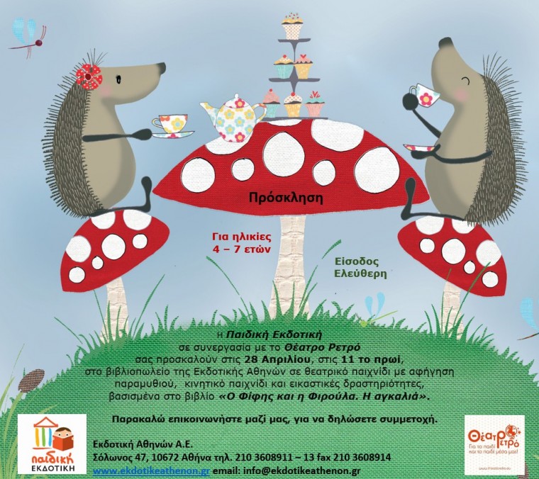 Η Παιδική Εκδοτική σε συνεργασία με το Θέατρο Ρετρό σας προσκαλούν στις 28 Απριλίου στις 11 το πρωί, στο βιβλιοπωλείο της Εκδοτικής Αθηνών σε θεατρικό παιχνίδι με αφήγηση παραμυθιού, κινητικό παιχνίδι και εικαστικές δραστηριότητες βασισμένα στο βιβλίο “Ο Φίφης και η Φιρούλα. Η αγκαλιά”.