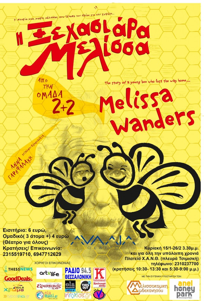Η Ξεχασιάρα Μελίσσα/Melissa Wanders της Άννας Γαρεφαλάκη, μια παράσταση για παιδιά στα ελληνικά και στα αγγλικά (με υπέρτιτλους) παρουσιάζεται κάθε Κυριακή στις 15:30 στο Θέατρο Αυλαία από την ομάδα 2+2.