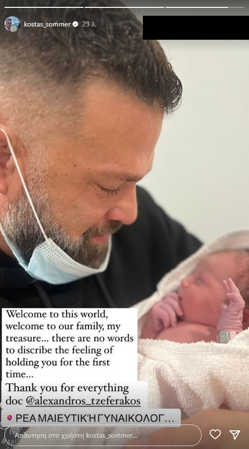 Συγκεκριμένα, ο ίδιος πόσταρε μια φωτογραφία στην οποία ποζάρει αγκαλιά με την νεογέννητη κόρη του. «Καλωσήρθες στον κόσμο, στην οικογένειά μας, θησαυρέ μου. Δεν υπάρχουν λόγια να περιγράψω το συναίσθημα του να σε κρατώ για πρώτη φορά», έγραψε ο Κώστας Σόμμερ, ευχαριστώντας τον γιατρό.