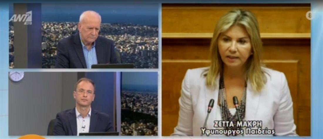 H υφυπουργός Παιδείας, Ζέττα Μακρή, με αφορμή την επαναλειτουργία της Δευτεροβάθμιας Εκπαίδευσης μίλησε στον ΑΝΤ1 όπου απάντησε σε μια σειρά ζητημάτων που άπτονται των αρμοδιοτήτων της.