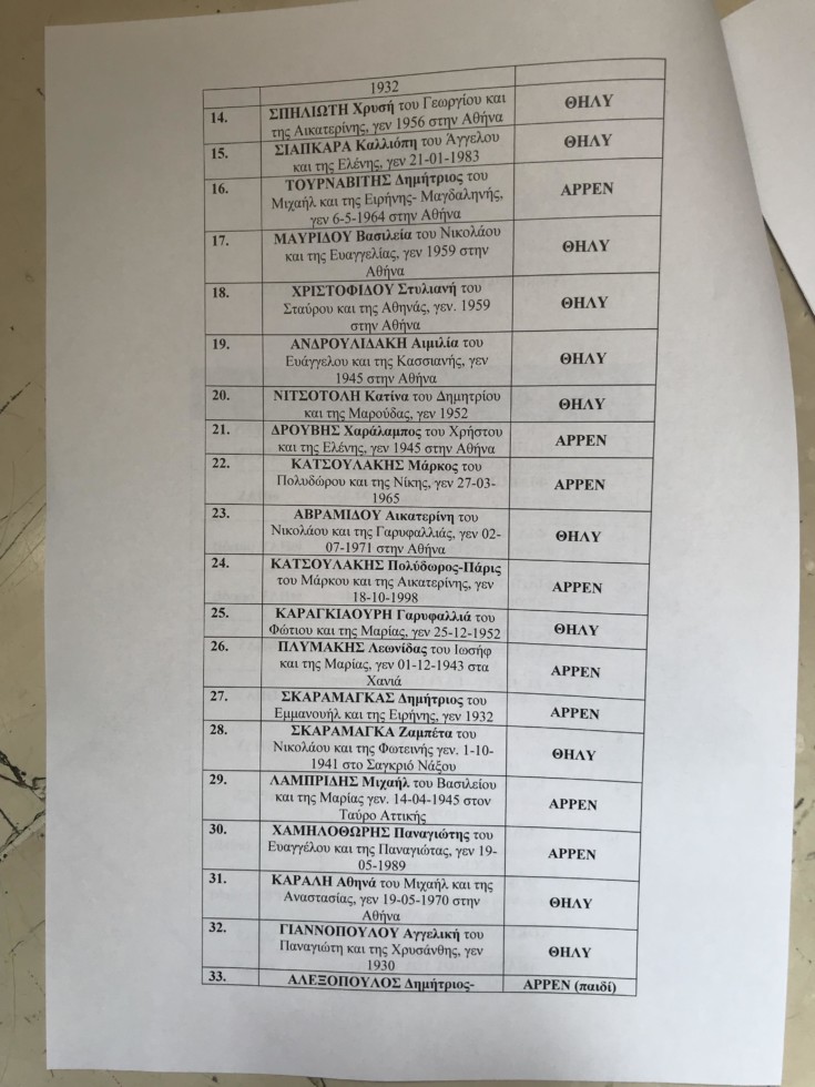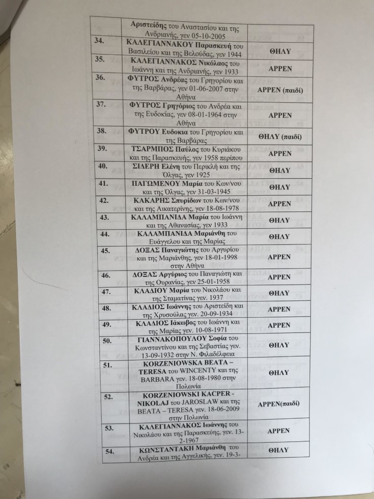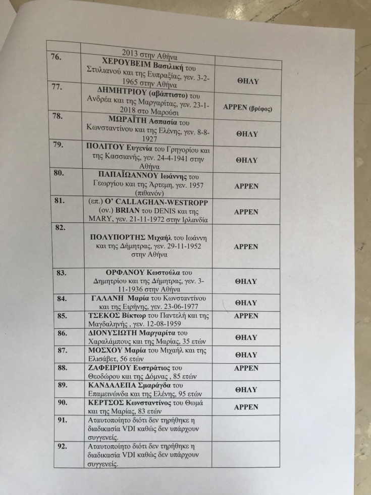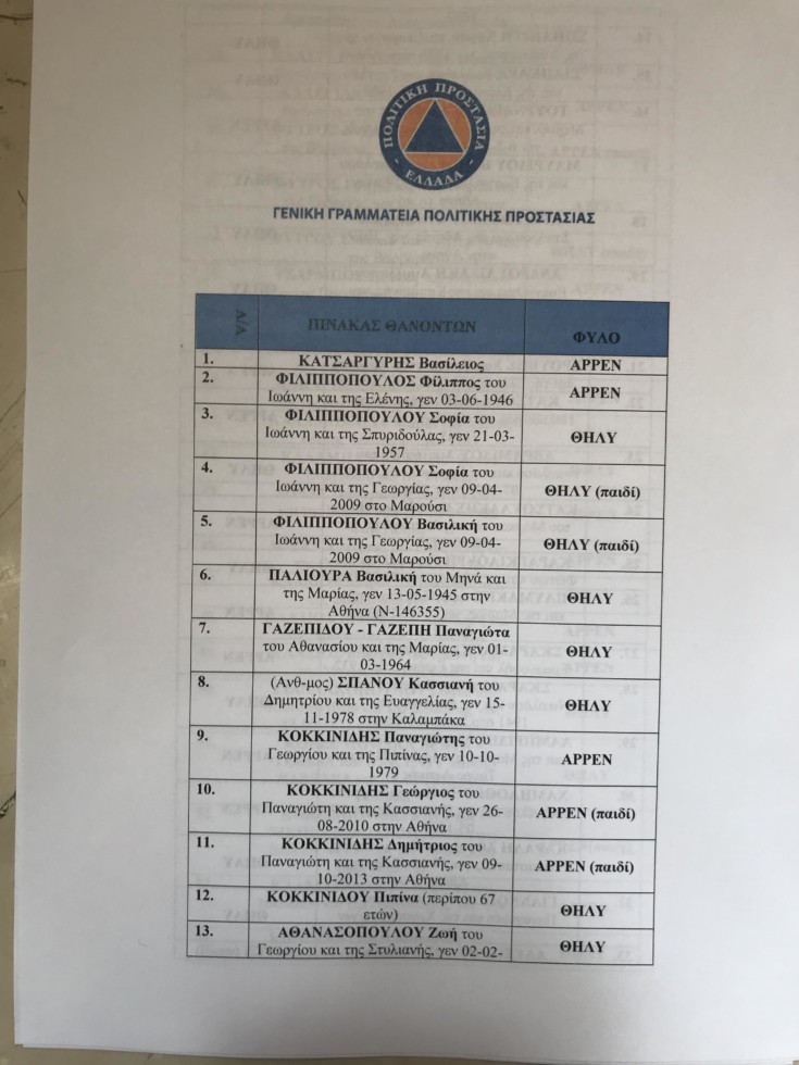 Τη λίστα με τα ονόματα των 92 νεκρών της φονικής πυρκαγιάς στο Μάτι και το Νέο Βουτζά, έδωσαν οι αρμόδιες υπηρεσίες. Ο τραγικός κατάλογος που στάλθηκε από την ιατροδικαστική υπηρεσία στην Εισαγγελία Αθηνών περιλαμβάνονται και όσοι πέθαναν στα νοσοκομεία, αλλά και δύο που δεν έχουν ταυτοποιηθεί – έχει απομονωθεί από αυτές τις σορούς DNA, αλλά δεν έχουν αναζητηθεί από συγγενικά πρόσωπα.