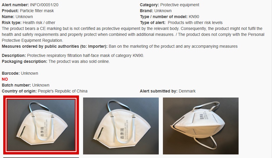 Για την απαγόρευση διάθεσης στην αγορά ακατάλληλων μασκών προσώπου ενημερωθήκαμε από το δελτίο για τα µη ασφαλή προϊόντα του Συστήµατος Ταχείας Ανταλλαγής Πληροφοριών (RAPEX).