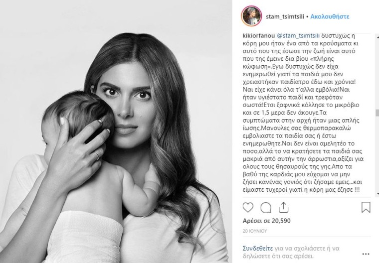 Και για όσους πιστεύουν, ότι η μηνιγγίτιδα είναι μία τόσο σπάνια νόσος που είναι σχεδόν αδύνατον το παιδί τους να κινδυνεύσει με κάποιον τρόπο από αυτή, η ανάρτηση της μαμάς Κικής Ορφανού στη σελίδα της δημοφιλούς παρουσιάστριας Σταματίνας Τσιμτσιλή στο Instagram κυριολεκτικά μας “έκοψε τα πόδια” -το παιδί της θα μπορούσε να είναι το δικό μας παιδί…