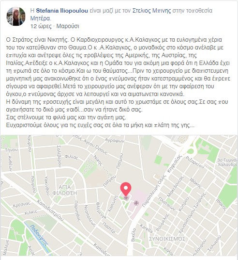 Το χειρουργείο του Στράτου πραγματοποιήθηκε χθες, από τον κορυφαίο Έλληνα καρδιοχειρουργό κ. Αυξέντιο Καλάγκο, για τον οποίον τόσα και τόσα εγκώμια έχουν γραφτεί –και πόσο αληθή τελικά αποδεικνύονται. Έτσι, χθες το βράδυ, με δάκρυα συγκίνησης διαβάσαμε τη νέα ανακοίνωση της μαμάς του:
