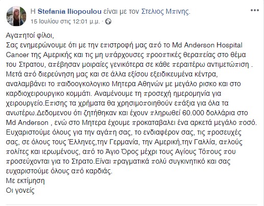 Ο Στράτος, λοιπόν, πράγματι βρέθηκε πριν από λίγες ημέρες στην Αμερική, στο Md Anderson Hospital Cancer, όπου σύμφωνα με σχετική ανάρτηση της μαμάς του, δεν μπόρεσε να αντιμετωπιστεί το πρόβλημά του. Πιο συγκεκριμένα: