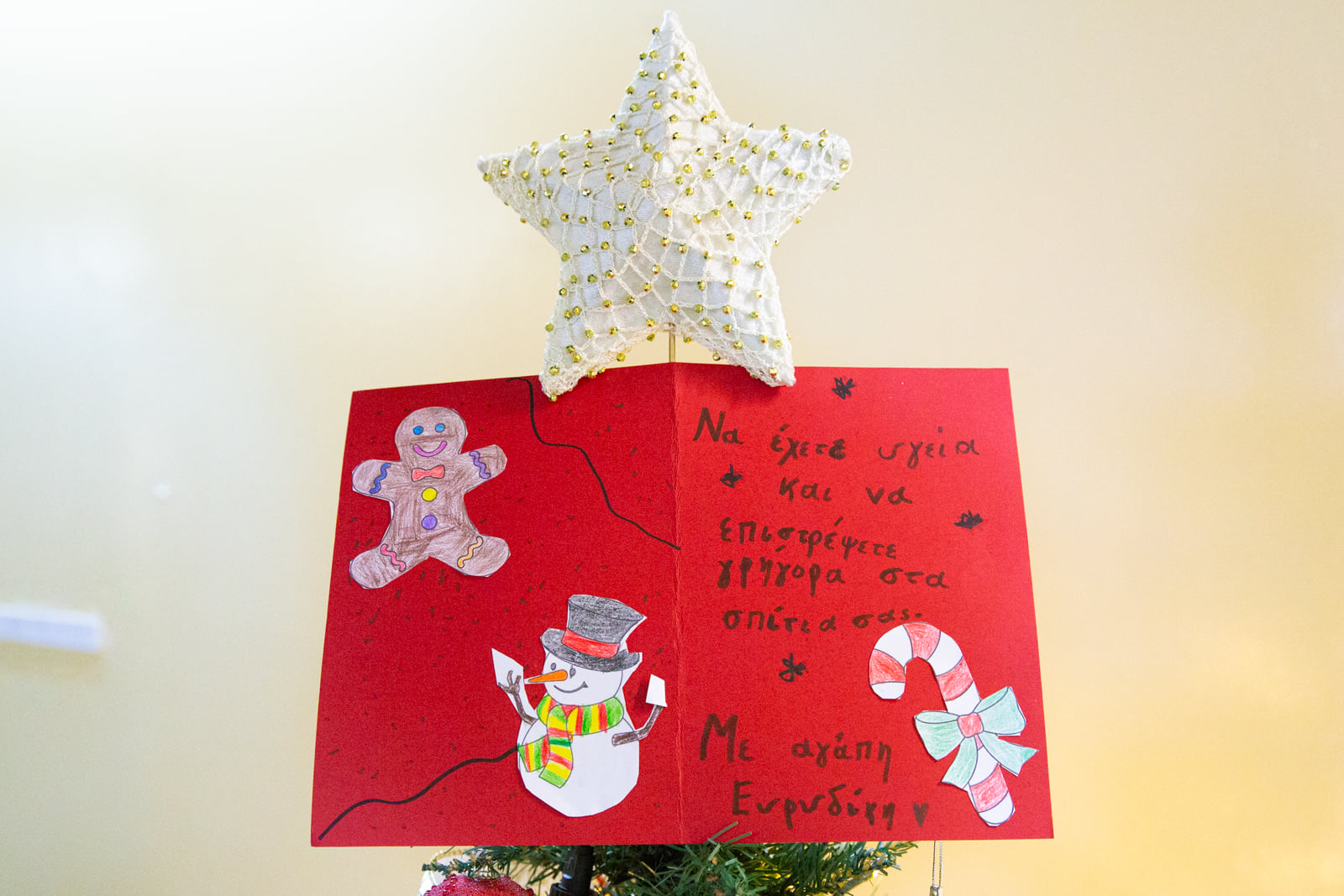 «Να έχετε υγεία και να επιστρέψετε γρήγορα στα σπίτια σας», έγραψε η Ευρυδίκη και στόλισε την κάρτα με γιορτινές χειροτεχνίες.