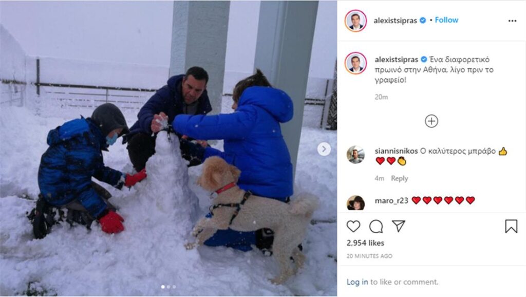 Ο αρχηγός της αξιωματικής αντιπολίτευσης, Αλέξης Τσίπρας, άδραξε την ευκαιρία να φτιάξει χιονάνθρωπο παρέα με τους γιους του, Ορφέα και Φοίβο, στο μπαλκόνι του σπιτιού τους.