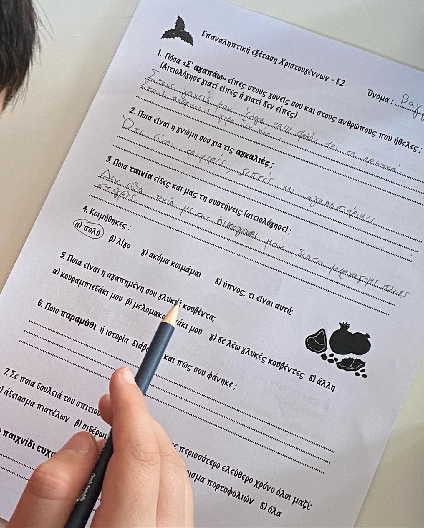 Όπως γράφει χαρακτηριστικά “ Καλή ΑΡΧΗ, καλή ΧΡΟΝΙΑ, καλή προσαρμογή! Εσείς γράψατε διαγώνισμα σήμερα; Πουλήσατε την παλιά χρονιά; Εμείς φορέσαμε πάλι τις πιτζάμες μας, για να είναι άνετη και ζεστή η επιστροφή και γράψαμε το διαγώνισμα των Εορτών, αφού επιμένουν όλοι να μας μιλούν για ύλη και διαγωνίσματα!