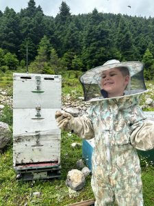 «Πηγαίνουμε στα μελίσσια μαζί με το μπαμπά μας κάθε Σαββατοκύριακο και τα καλοκαίρια που δεν έχουμε σχολείο! Φοράμε πάντα την ειδική στολή και πλησιάζουμε τις κυψέλες! Όταν γίνεται ο τρύγος, με τον καπνό καπνίζουμε την κυψέλη και βγάζουμε πολύ προσεκτικά τα τελάρα! Εννοείται ότι ξεχωρίζουμε πάντα την βασίλισσα!» λένε με πλατύ χαμόγελο τα δύο αγοράκια!