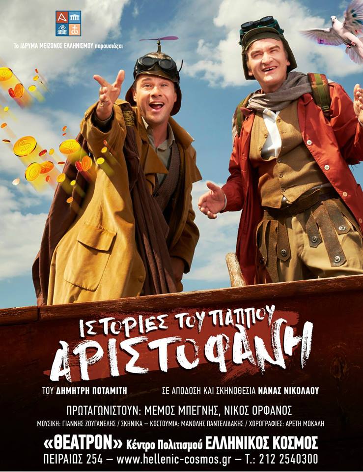 Το διαχρονικό έργο του Δημήτρη Ποταμίτη «Οι ιστορίες του παππού Αριστοφάνη» ανεβαίνει από το Σάββατο 20 Οκτωβρίου στο «Θέατρον» του Κέντρου Πολιτισμού «Ελληνικός Κόσμος» σε απόδοση και σκηνοθεσία Νανάς Νικολάου, από το Ίδρυμα Μείζονος Ελληνισμού. Πρωταγωνιστές σε έναν θίασο 11 εξαιρετικών ηθοποιών είναι ο Μέμος Μπεγνής και ο Νίκος Ορφανός.