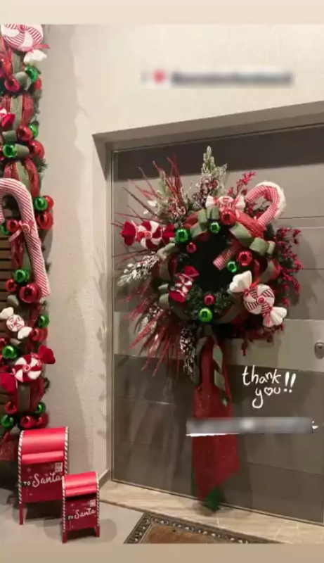 Στην πόρτα του σπιτιού η Ολυμπία Χοψονίδου έβαλε ένα υπέροχο στεφάνι, διακοσμημένο με κόκκινες καραμέλες και γιορτινές μπάλες. Δίπλα στην πόρτα είδαμε δύο πολύ χαριτωμένα γραμματοκιβώτια για τον Άη Βασίλη.