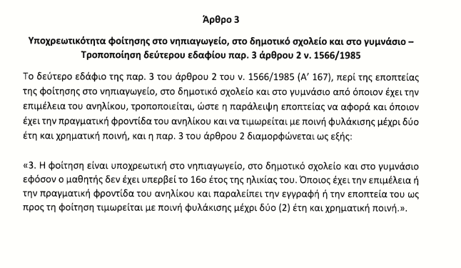 Η διάταξη προβλέπει ότι όποιος έχει την επιμέλεια ή την πραγματική φροντίδα του ανηλίκου και παραλείπει την εγγραφή ή την εποπτεία του ως προς την υποχρεωτική φοίτηση (μέχρι και το Γυμνάσιο), τιμωρείται με ποινή φυλάκισης μέχρι δύο έτη και χρηματική ποινή.