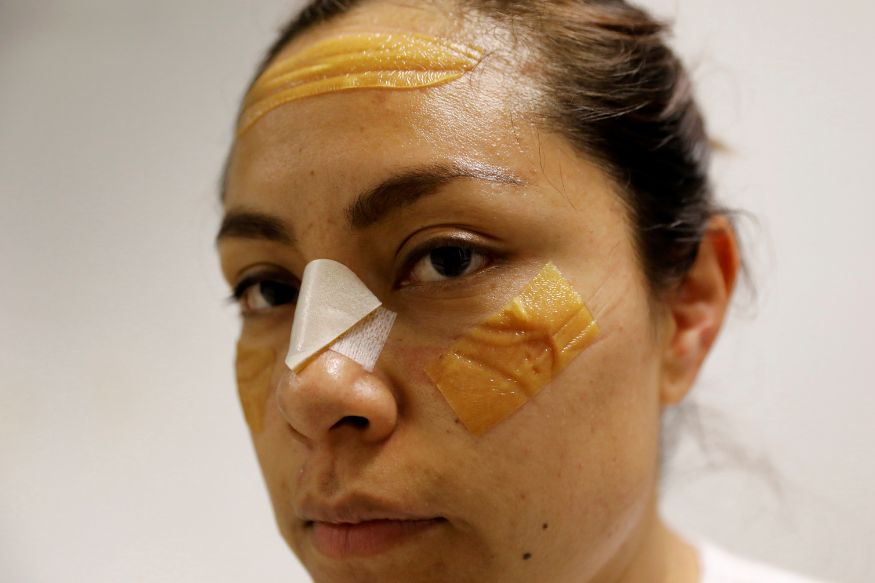 Με τσιρότα στο πρόσωπο για να ανακουφίσει τα σημάδια που της άφησε η μάσκα προστασίας, έπειτα από ατελείωτες ώρες φροντίδας ασθενών σε νοσοκομείο του Μεξικό. (φωτο: Reuters)