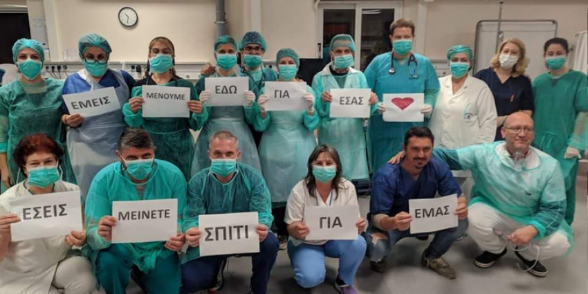 Έλληνες γιατροί και νοσηλευτές νοσοκομείου στη Λάρισα με το μήνυμα των τελευταίων μηνών που η πλειοψηφία των Ελλήνων σεβάστηκε και ακολούθησε:
