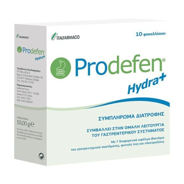 Συμπληρώματα διατροφής που περιέχουν 7 είδη ωφέλιμων βακτηρίων, φρουκτοολιγοσακχαρίτες και ηλεκτρολύτες, όπως το Prodefen® Hydra+ είναι σχεδιασμένα για να αποκαθιστούν και να διατηρούν την ισορροπία του εντερικού μικροβιώματος. Είναι ιδιαίτερα χρήσιμα σε καταστάσεις κινδύνου αφυδάτωσης, όπως διάρροια, έμετος, έντονη εφίδρωση και σύνδρομο ευερέθιστου εντέρου.