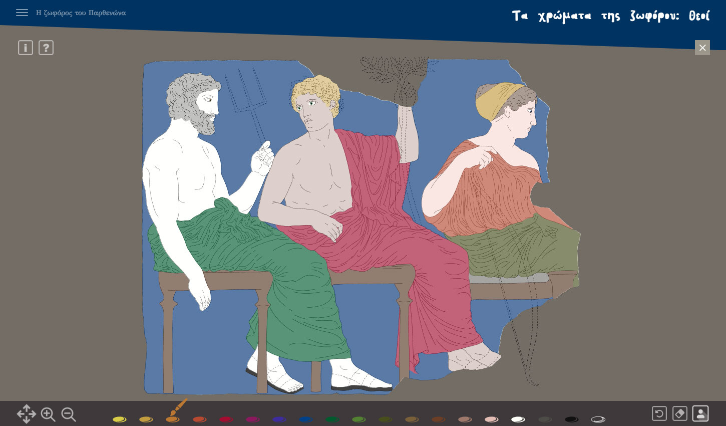 Με το παιχνίδι «Τα χρώματα της ζωφόρου» γινόμαστε αρχαίοι ζωγράφοι. Διαλέγουμε τα χρώματα που επιθυμούμε από την παλέτα στο κάτω μέρος της οθόνης και επιλέγουμε ανάμεσα σε τρείς λίθους (με τις παραστάσεις: Βόδια και οδηγοί, Υδριαφόροι, Θεοί) την περιοχή που θέλουμε να χρωματίσουμε.