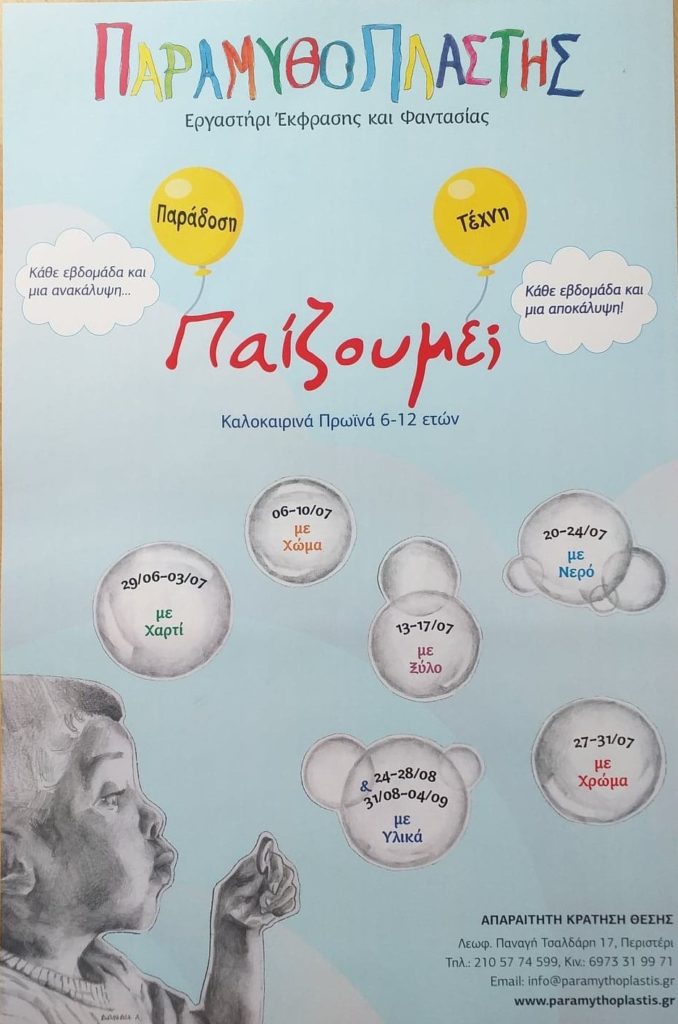 Καλοκαιρινά πρωινά εργαστήρια για παιδιά σχολικής ηλικίας, διοργανώνει και αυτό το καλοκαίρι το εργαστήρι Έκφρασης και Φαντασίας “Παραμυθοπλάστης”.