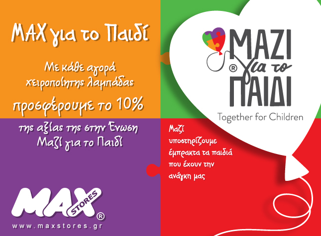 Τα MAX STORES με το πρόγραμμα «ΜΑΧ για το Παιδί» γιορτάζουν το Πάσχα στηρίζοντας την Ένωση «Μαζί για το Παιδί» βοηθώντας έμπρακτα τα παιδιά που έχουν την ανάγκη μας. Με την αγορά κάθε χειροποίητης πασχαλινής λαμπάδας τα MAX STORES προσφέρουν το 10% της αξίας της στην Ένωση «Μαζί για το Παιδί». Στόχος της ενέργειας είναι η κάλυψη βασικών αναγκών και ο ανεφοδιασμός φορέων που υποστηρίζουν παιδιά και οικογένειες μέσω του προγράμματος «Προσφέρω γιατί Νοιάζομαι» που υλοποιεί το «Μαζί για το Παιδί». Τις λαμπάδες «MAX για το παιδί» μπορείτε να τις βρείτε σε όλα τα φυσικά καταστήματα MAX STORES, καθώς και στο ηλεκτρονικό κατάστημα www.maxstores.gr