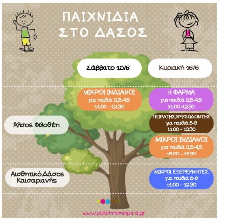 Για αυτό το Σαββατοκύριακο θα βρείτε από την Πολύχρωμη Σπείρα 4 προγράμματα στη δροσερή Φιλοθέη αλλά και την καταπράσινη Καισαριανή και για τους μικρούς και για τους μεγάλους μας φίλους. Φάρμα, Ινδιάνοι, Πειρατές και εξερευνητές, και αυτή τη φορά και σε απογευματινές δράσεις!