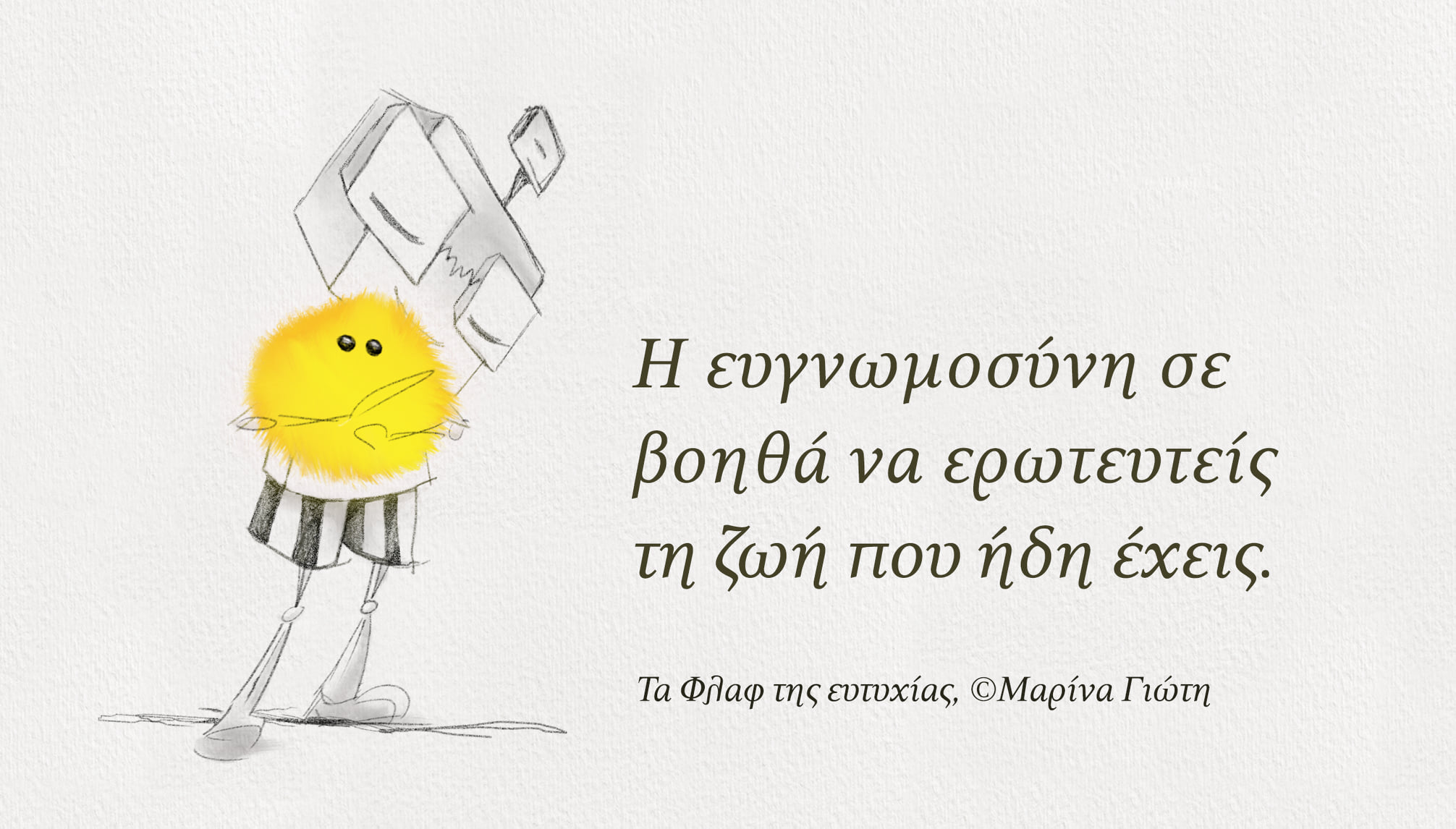 Υπό το πρίσμα αυτής της συνθήκης το καινούργιο βιβλίο της Μαρίνας Γιώτη “Τα Φλαφ της ευτυχίας” που κυκλοφορεί από τις εκδόσεις Διόπτρα είναι ένας ύμνος στην ευγνωμοσύνη. Πόσο άδεια και μάταιη θα ήταν η ζωή μικρών και μεγάλων δίχως αυτή. Αλήθεια το έχετε σκεφτεί ποτέ;
