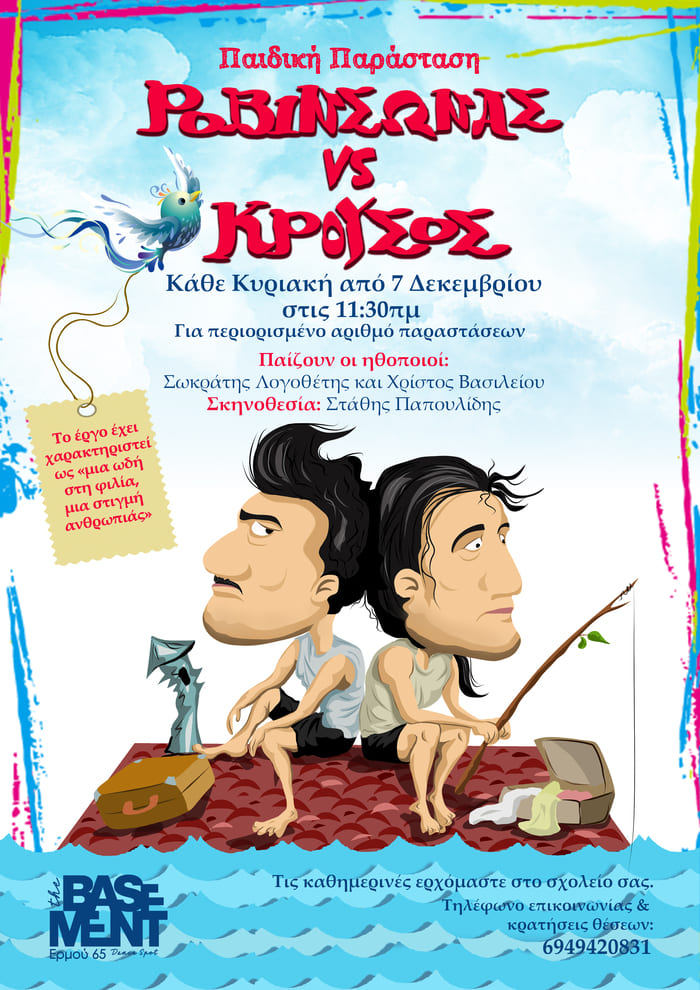 Η παιδική θεατρική παράσταση “ΡΟΒΙΝΣΩΝΑΣ VS ΚΡΟΥΣΟΣ” των Νίνο ντ’ Ίντρόνα και Τζάκομο Ραβέκιο ανέβηκε από τις 7 Δεκεμβρίου στο The Basement Spot και θα συνεχίσει να παρουσιάζεται κάθε Κυριακή, στις 11:30 π.μ., για περιορισμένο αριθμό παραστάσεων.