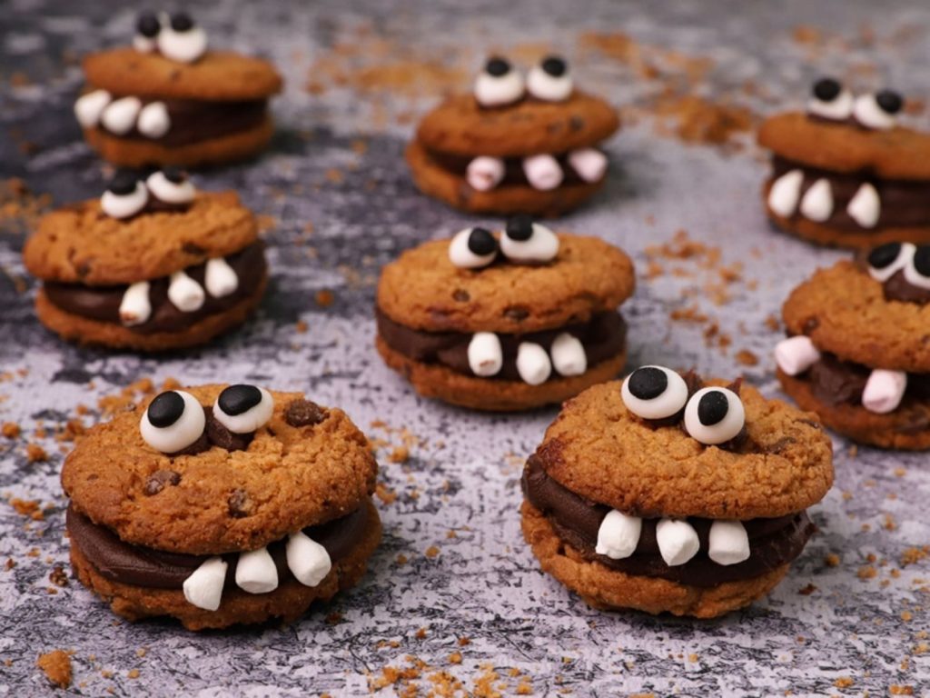 Ψήστε απλά μπισκότα βουτύρου ή σοκολάτας και, όσο είναι ακόμα ζεστά, προσθέστε επάνω μικρά ζαχαρωτά μάτια (τα βρίσκετε στα σούπερ μάρκετ ή στα ζαχαροπλαστεία). Μια άλλη καλή ιδέα είναι να γεμίσετε τα μπισκότα με ταχίνι κακάο και να προσθέσετε και δοντάκια. Μπορείτε να τα φτιάξετε και με τα παιδιά — διασκεδαστικό και πανεύκολο!