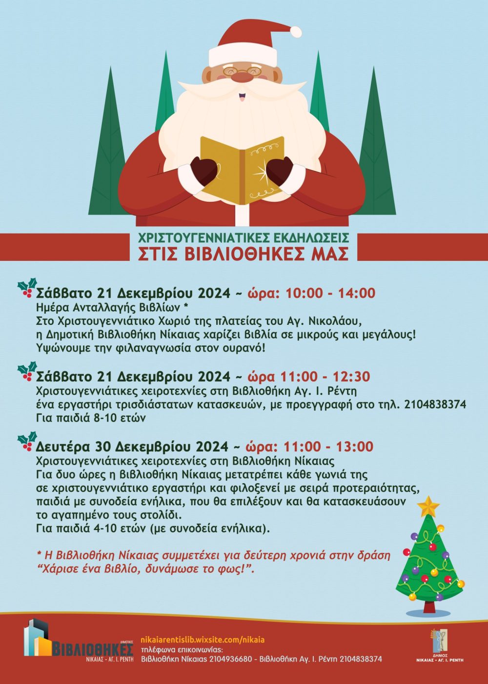 Οι Δημοτικές Βιβλιοθήκες Νίκαιας-Αγ.Ι. Ρέντη διοργανώνουν μια σειρά Χριστουγεννιάτικων εκδηλώσεων και μεταμορφώνονται σε εργαστήρια δημιουργίας.
