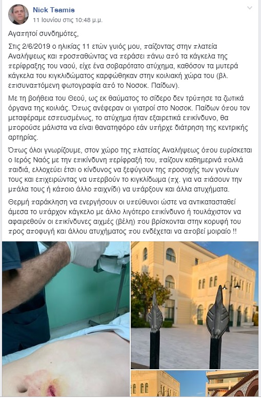 Όπως έγραψε ο μπαμπάς του παιδιού στη σελίδα “Μένουμε Βριλήσια” στο Facebook “Στις 2/6/2019 ο ηλικίας 11 ετών γιος μου, παίζοντας στην πλατεία Αναλήψεως και προσπαθώντας να περάσει πάνω από τα κάγκελα της περίφραξης του ναού, είχε ένα σοβαρότατο ατύχημα, καθόσον τα μυτερά κάγκελα του κιγκλιδώματος καρφώθηκαν στην κοιλιακή χώρα του (βλ. επισυναπτόμενη φωτογραφία από το Νοσοκ. Παίδων).Με τη βοήθεια του Θεού, ως εκ θαύματος το σίδερο δεν τρύπησε τα ζωτικά όργανα της κοιλιάς. Όπως ανέφεραν οι γιατροί στο Νοσοκ. Παίδων όπου τον μεταφέραμε εσπευσμένως, το ατύχημα ήταν εξαιρετικά επικίνδυνο, θα μπορούσε μάλιστα να είναι θανατηφόρο εάν υπήρχε διάτρηση της κεντρικής αρτηρίας.