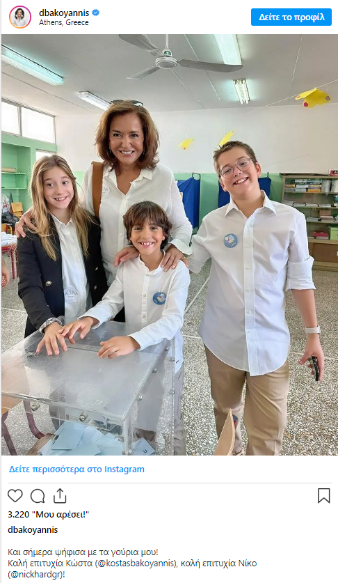 Η Ντόρα Μπακογιάννη έφτασε στο εκλογικό κέντρο της περιοχής της μαζί με τα «γούρια» της, όπως αποκαλεί τα εγγόνια της. Μάλιστα φωτογραφήθηκε μαζί τους μπροστά στην κάλπη και κοινοποίησε το στιγμιότυπο στα social media με τη λεζάντα «Και σήμερα ψήφισα με τα γούρια μου! Καλή επιτυχία Κώστα καλή επιτυχία Νίκο».