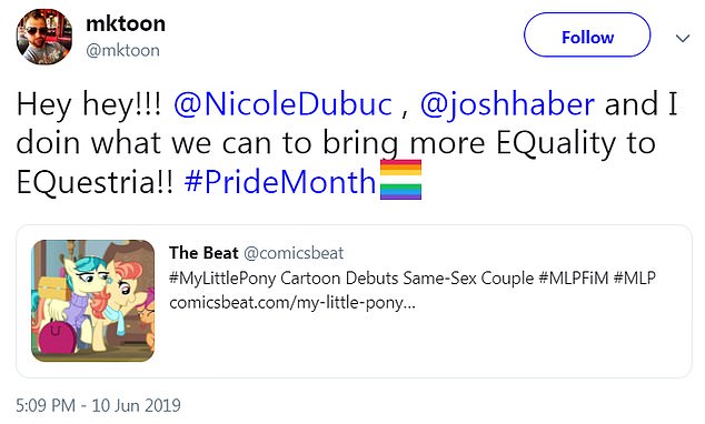 ‘Hey hey!!! @NicoleDubuc , @joshhaber and I doin what we can to bring more EQuality to EQuestria!! #PrideMonth,’ Vogel posted on Twitter, mentioning showrunners.