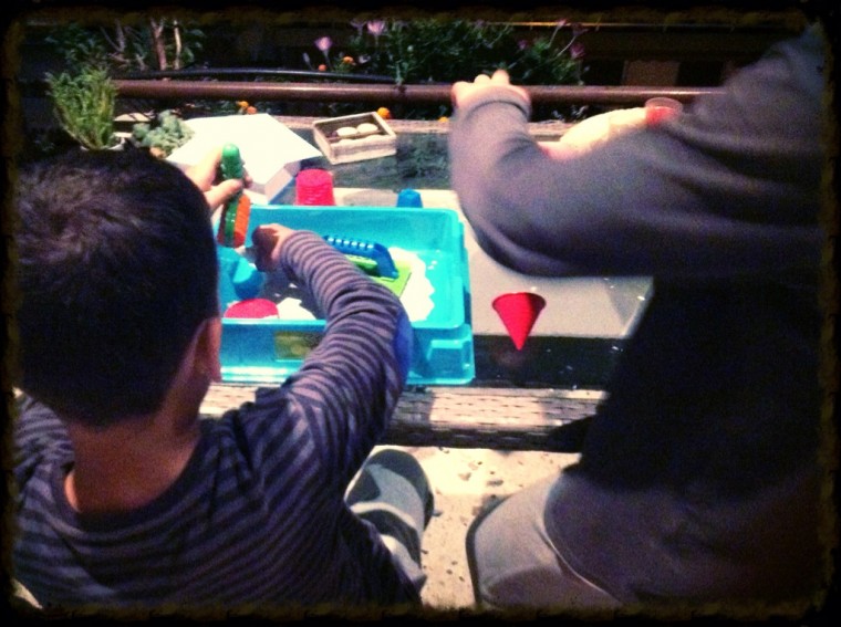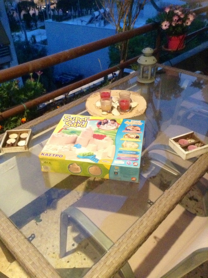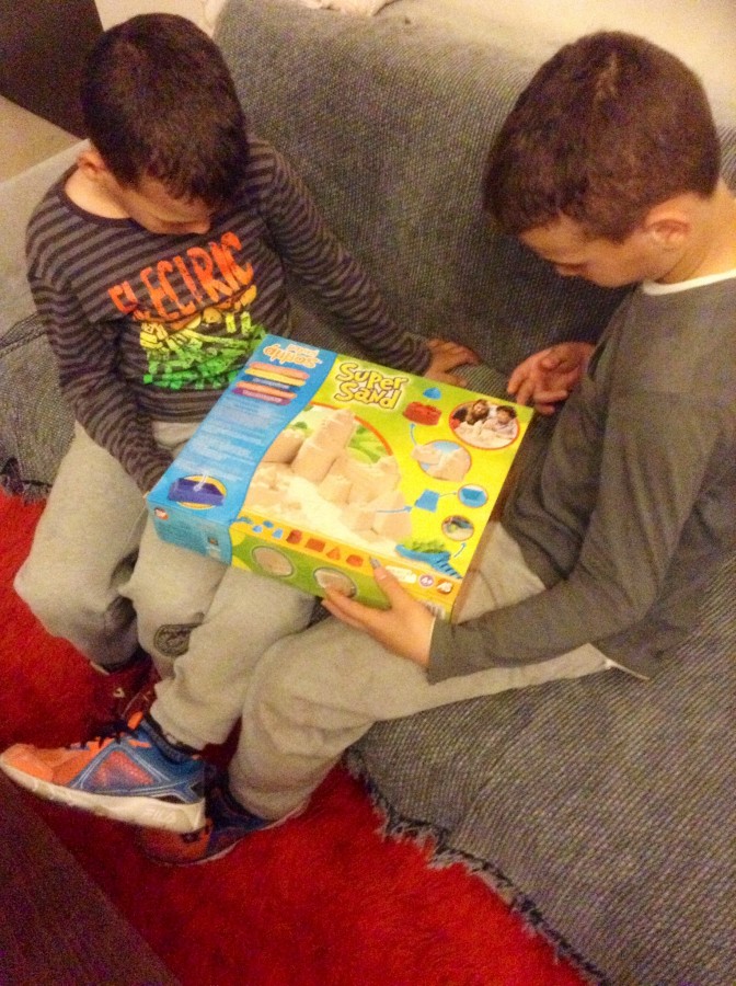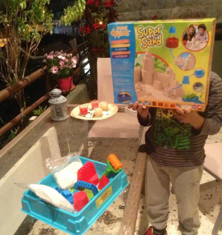 Φτάνοντας στο σπίτι τα παιδιά περίμεναν όλο χαρά το νέο τους παιχνίδι. Ξέχασα να σας πω ότι τα μικρά μου επανειλημμένως μου ζητούσαν να τους πάρω άμμο για να κάνουν κατασκευές αλλά εγώ πάντα το ανέβαλα με χίλιες δυο δικαιολογίες καθώς φοβόμουν την ποιότητα τέτοιου είδους υλικών αλλά και με λυπόμουν να τρέχω με τη σκούπα να απορροφήσω και τον παραμικρό κόκκο άμμου που τρυπώνει σε κάθε γωνιά του χώρου.