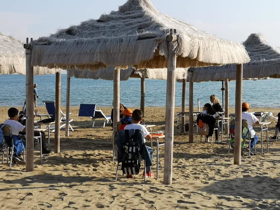 Οι μαθητές παρακολουθούν τα μαθήματα έχοντας θέα στη θάλασσα, τα θρανία βρίσκονται τοποθετημένα στην άμμο και από πάνω τους για να είναι προφυλαμένοι οι μαθητές από τον ήλιο βρίσκονται ανοιχτές οι κλασικές ομπρέλες της παραλίας.