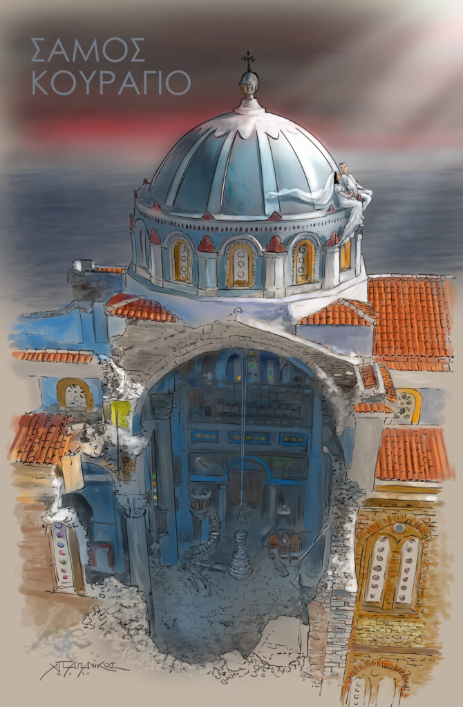 Για ακόμα μία φορά ένα σκίτσο του κ. Χρήστου Παπανίκου κάνει τον γύρο των social media προκαλώντας δάκρυα συγκίνησης. Ο λόγος γι’αυτό που βλέπουμε στην τελευταία ανάρτηση του προσωπικού του λογαριασμού στο Facebook και απεικονίζει δύο παιδιά, ντυμένα στα λευκά, καθισμένα στο καμπαναριό μιας εκκλησίας με τα λόγια: ΣΑΜΟΣ ΚΟΥΡΑΓΙΟ.