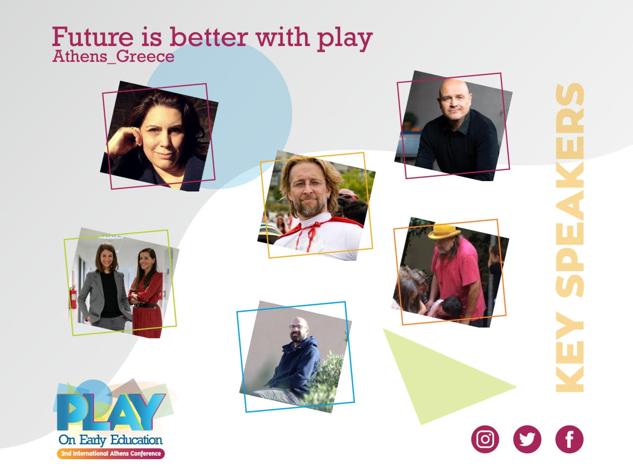Ήδη έχουν ανακοινωθεί οι βασικοί ομιλητές, οι οποίοι θα είναι η πολύ γνωστή Σουηδή παιδαγωγό Suzanne Axelsson, τον «Teacher Tom» (aka Tom Hobson) από το Σιάτλ που θεωρείται από τους καλύτερους δασκάλους προσχολικής αγωγής στον κόσμο, ο Βρετανός playworker με 46 χρόνια εμπειρία Meynell Walter,o διευθυντής στο εργαστήριο ύπνου του πανεπιστημίου της Στοκχόλμης John Axelsson, οι συνιδρύτριες του δικτύου υποστήριξης γυναικών Women on top Στέλλα Κάσδαγλη και Πηνελόπη Θεοδωρακάκου (διότι η κατάκτηση της έμφυλης ισότητας, ξεκινά στο preschool) και ο δάσκαλος που κατάφερε να μετατρέψει ένα δημόσιο σχολείο σε ένα ορεινό χωριό της Κρήτης, σε ένα εκπαιδευτικό μοντέλο δημιουργικής αυτοδιαχείρισης Άγγελο Πατσιά.