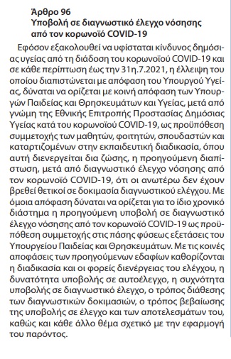 Με όμοια απόφαση δύναται να ορίζεται για το ίδιο χρονικό διάστημα η προηγούμενη υποβολή σε διαγνωστικό έλεγχο νόσησης από τον κορωνοϊό COVID-19 ως προϋπόθεση συμμετοχής στις πάσης φύσεως εξετάσεις του Υπουργείου Παιδείας και Θρησκευμάτων.
