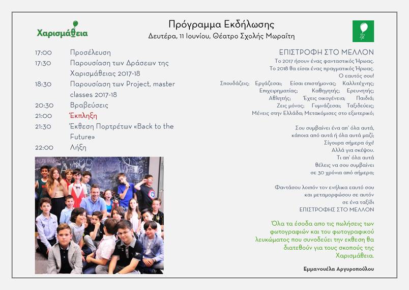 Στα πλαίσια της τελετής λήξης θα υπάρχει έκθεση πορτρέτων των παιδιών και το ετήσιο λεύκωμα με θέμα «Back to the Future»