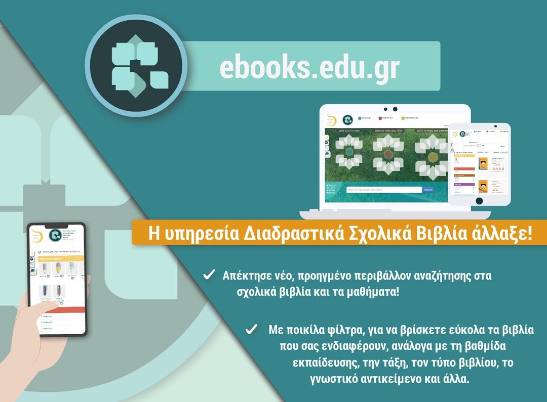 Η υπηρεσία Διαδραστικά Σχολικά Βιβλία άλλαξε, παρέχοντας νέα, εύχρηστα εργαλεία αναζήτησηςσε μαθητές και εκπαιδευτικούς, που πλέον θα μπορούν να πλοηγούνται στον ιστότοπο και να εντοπίζουν ευκολότερα το αντικείμενο αναζήτησής τους, χρησιμοποιώντας λέξεις-κλειδιά και φίλτρα.