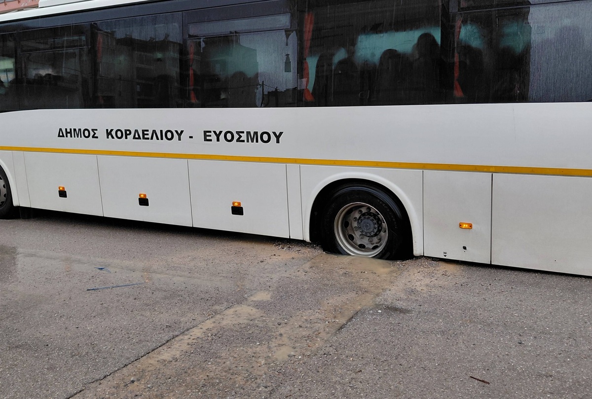 Λεωφορείο του Δήμου Κορδελιού – Ευόσμου που μετέφερε μαθητές έπεσε σε λακούβα στην προέκταση Ολυμπιάδος και ακινητοποιήθηκε.