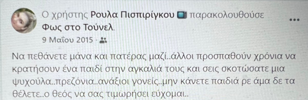 «Να πεθάνετε μάνα και πατέρας μαζί… άλλοι προσπαθούν χρόνια να κρατήσουν ένα παιδί στην αγκαλιά τους και σεις σκοτώσατε μία ψυχούλα… πρεζόνια… ανάξιοι γονείς… μην κάνετε παιδιά ρε άμα δεν τα θέλετε… ο θεός να σας τιμωρήσει εύχομαι» είχε γράψει στην ανάρτησή της.