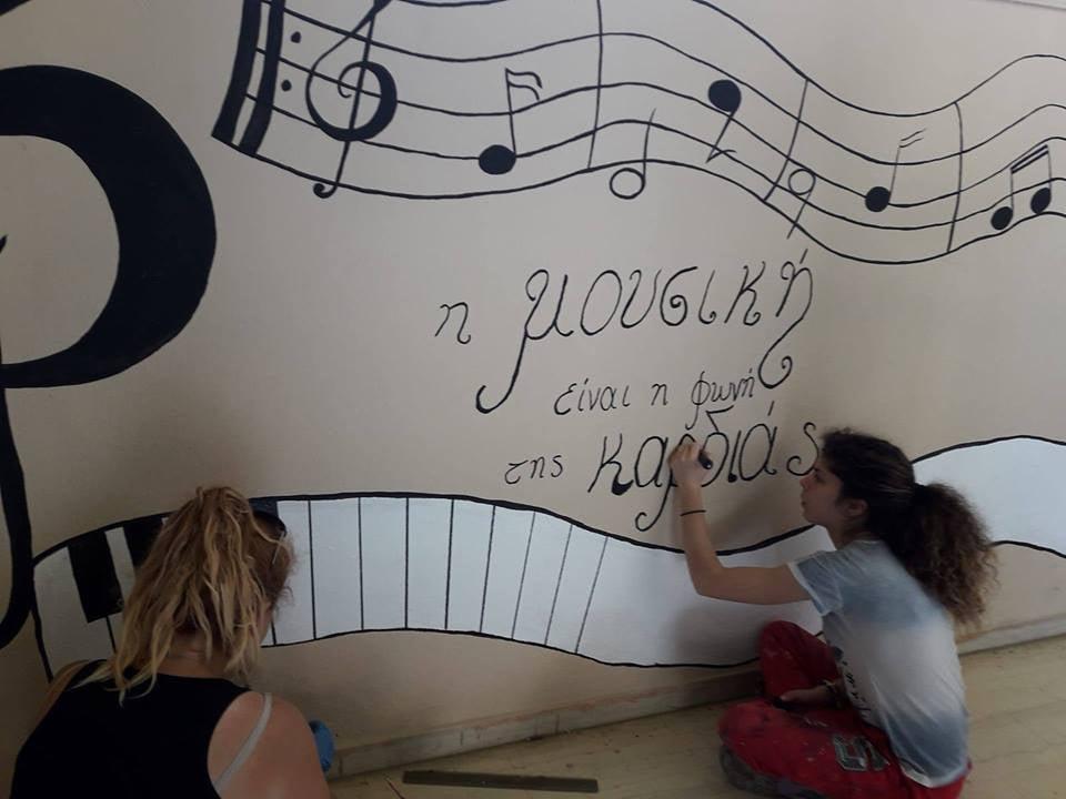 Εν συνεχεία ανέλαβαν δράση και ζωγράφισαν και ορισμένους από τους εξωτερικούς τοίχους του σχολείου. Όπως μας δήλωσαν με χαρά “Βάψαμε, ζωγραφίσαμε, δώσαμε χρώμα και ζωή στους μονόχρωμους και απρόσωπους τοίχους του σχολείου και η λάμψη που είδαμε στα μάτια των μαθητών ήταν η επιβράβευση της προσπάθειάς μας.”