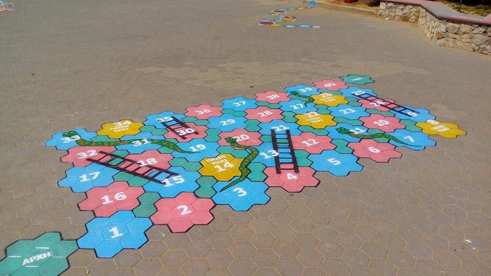 Η αρχή έγινε με τα κλασικά επιδαπέδια παιχνίδια τύπου “κουτσό” και φιδάκι. Η Μαρία σχεδίαζε, η Ρούλα, η Ερατώ, ο Κώστας, η Νέρι, η Κατερίνα, η Ειρήνη, η Μαρία και οι μαθητές χρωμάτιζαν.