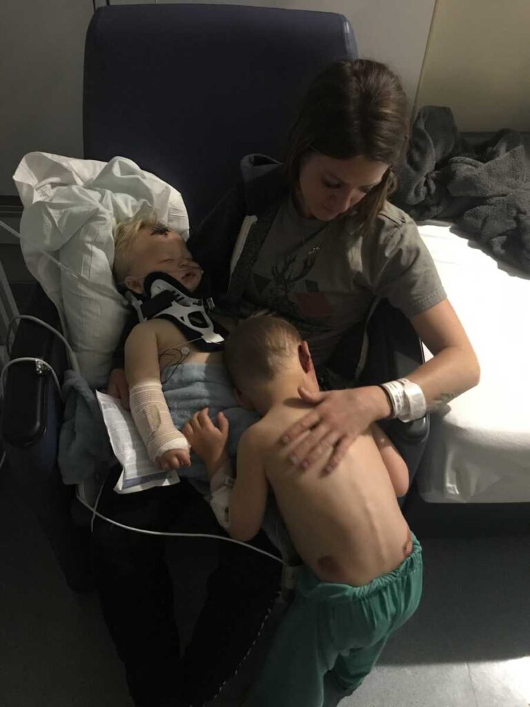 Είχε έρθει η ώρα να μεταφερθούν στο νοσοκομείο. Έπρεπε να επιλέξω να μείνω με το μεγαλύτερο παιδί μου που ήταν ημιλιπόθυμο. Μεταφερθήκαμε στο νοσοκομείο. Διαπιστώθηκε ότι ο μεγαλύτερος γιος μου είχε σπάσει το οστό της κλείδας, είχε κοπεί ένα κομμάτι από αυτί, κακώσεις και εγκεφαλική αιμορραγία. Του πήρε αρκετές μέρες μέχρι να συνέλθει και να σηκωθεί από το κρεβάτι.